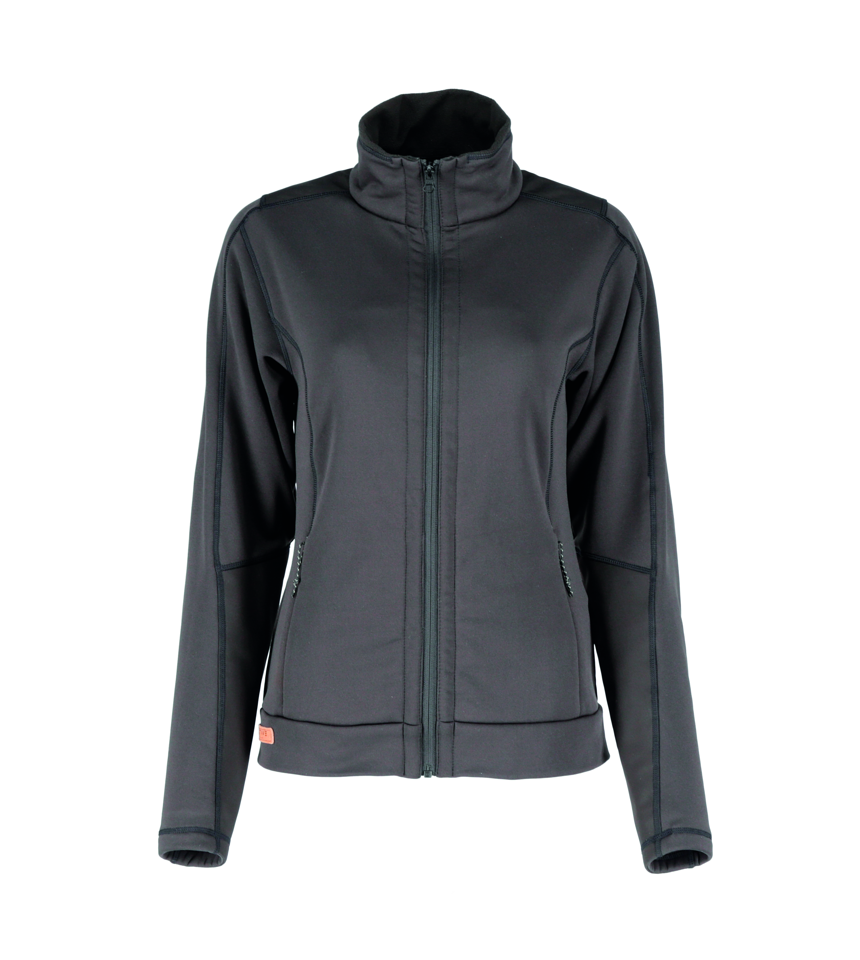 Dame outdoor fleece jakke i sort, komfortabelt og fleksibelt materiale, gennemgående lynlås og 2 lommer med lynlås. Forstærkninger på undersiden af ørmet. 95%polyester, 5% elastan 245g/m²