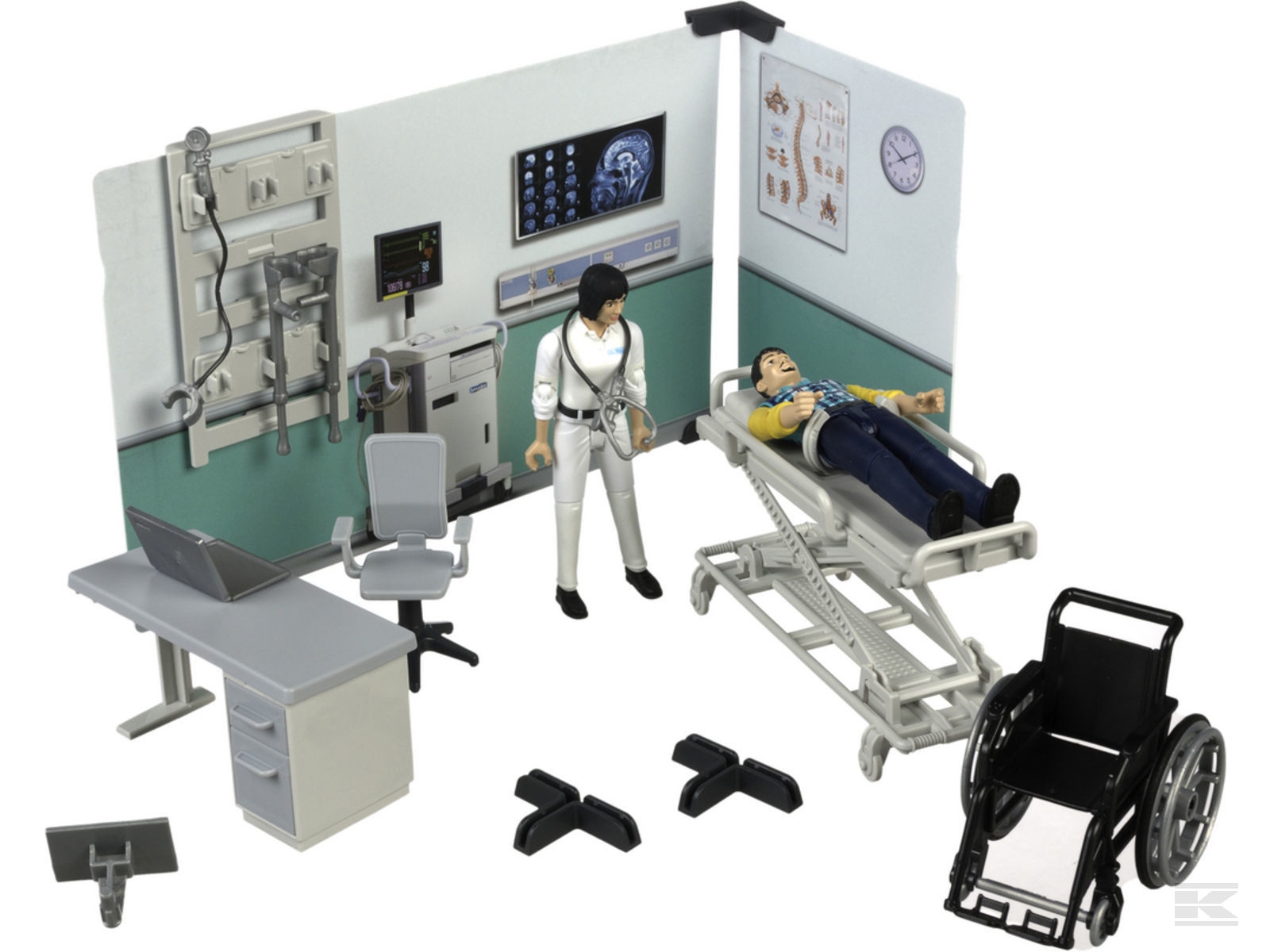 Medicinsk udstyr, stetoskop, blodtryksmåler, krykker og forbindinger.