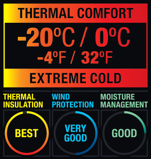 Varmeisolerende Materiale, og med høj grad eller fuldstændig vindbeskyttelse mod ekstrem kulde eller blæsevejr.