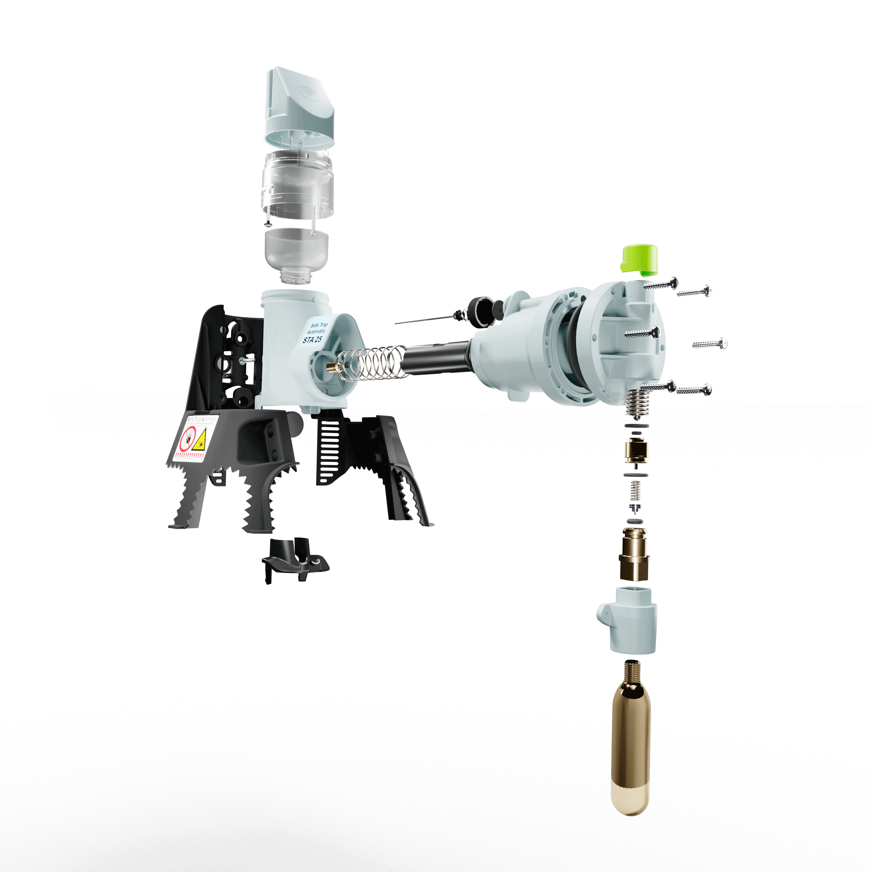 Camro Rotte-/Musefælde STA Automatic-25 Automatisk giftfri fælde til mus og rotter. Slår automatisk rotter og mus ihjel – en efter en. Dyrene tiltrækkes ved at fylde magasinet på følden med lokkemad Du kan anvende forskellige lokkemidler afhængig af hvilket miljø du har. Landbrug: Korn, frø, svinefoder mm. Privat: Chokolade, rosiner, Nutella mm. Den gennemsigtige top har ventilation som spreder duften af lokkemiddel. Fælden har integreret stige, så mus og rotter nemt kan kravle op i fælden. Når dyrene stikker hovedet op i fælden efter lokkemaden, udløses fælden og dyrene aflives med det samme. De døde mus/rotter falder til jorden og bliver fjernet af ræv, kat, rovfugl eller lign. Gasbeholderen kan skyde min 25 gange før den skal skiftes. Fælden leveres med et monteringsbeslag, som er nemt at montere på f.eks. et træ eller en træstolpe. Er udstyret med NFC baseret sensor som bl.a. registrerer dato og tid for hvert skud. Download den gratis app, og få alle relevante informationer på din mobiltelefon. Fælden er CE-godkendt og patenteret. Produceret i Danmark. Æsken indeholder: Rotte/musefælde STA Automatic-25 Patron CO2 Magasin til lokkemiddel Beskyttelseskurv Tæller