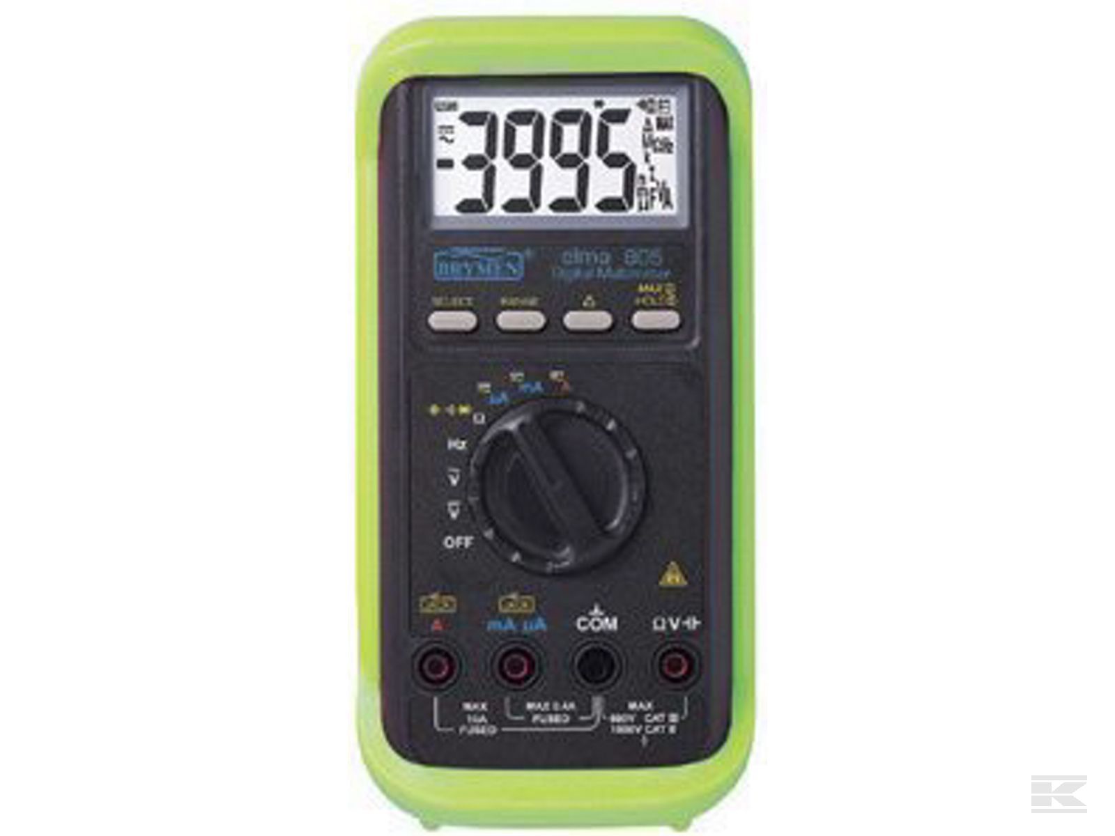 Elma 805 digitalmultimeter med gummikappe Måler spænding, strøm, frekvens, modstand, kapacitet, dioder og gennemgang. Elma 805 er et godt robust multimeter med automatisk områdevalg, relativ måling samt både 30ms maxhold og datahold. Instrumentet tåler overbelastning, advarer ved fejltilslutning og er forsynet med højeffektive sikringer. Elma 805 opfylder IEC 61010-1 KAT III 600V og leveres komplet inkl. dansk betjeningsvejledning, batteri, testledninger og robust gummibeskyttelseskappe Tekniske data: Spænding DC: 0-400m-4-40-400-1000V. Nøjagtighed: +/- 0,5% + 3digit. Spænding AC: 0-4-40-400-1000V. Nøjagtighed: +/- 1% + 5digit. Strøm: AC/DC: 0-400µ -4m-40m-400m-4-10A. Modstand: 0-400-4K-40K-400K-4M-40M Ohm. Frekvens: 30Hz-4MHz. Kapacitet: 0-500n-5µ -50µ -500µ -500µF. Display: 3 3/4 ciffer. Max. visning: 3999. Batteri: 2x1,5V LR03 (inkluderet). Mål: 186x87x45 mm. Vægt: 390 gram