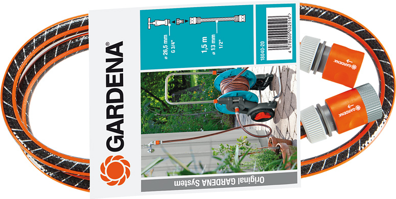 Med et GARDENA Tilslutningssæt kan du tilslutte din slangevogn eller -tromle til vandkilden. Slangen er nem at tilslutte med originale GARDENA System-fittings, nærmere betegnet to styk standard slangekobling (varenr. 915) og én hanekobling (varenr. 901). Selve slangen har en standardlængde på 150 cm og er en FLEX-slange med en diameter på 13 mm (1/2') og et maks. tryk på 25 bar. Til enkel og hurtig tilslutning af en slangevogn eller -tromle til vandkilden.
