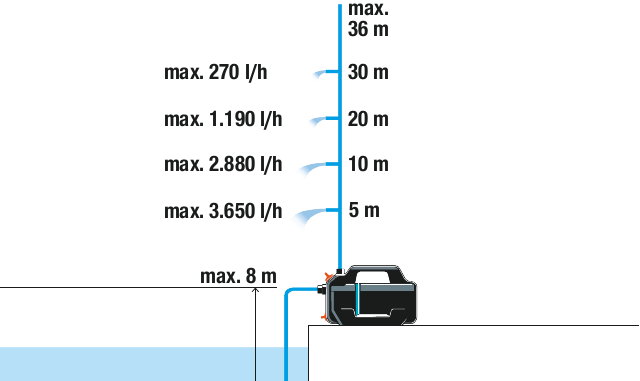 Maks suge dybde: 8 m