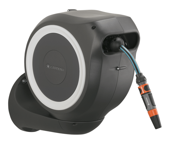 Leveres med et vægbeslag, en 15 meter 11mm vandslange, en tilslutningsslange, alle nødvendige originale GARDENA-systemdele samt en dyse med to forskellige sprayindstillinger.