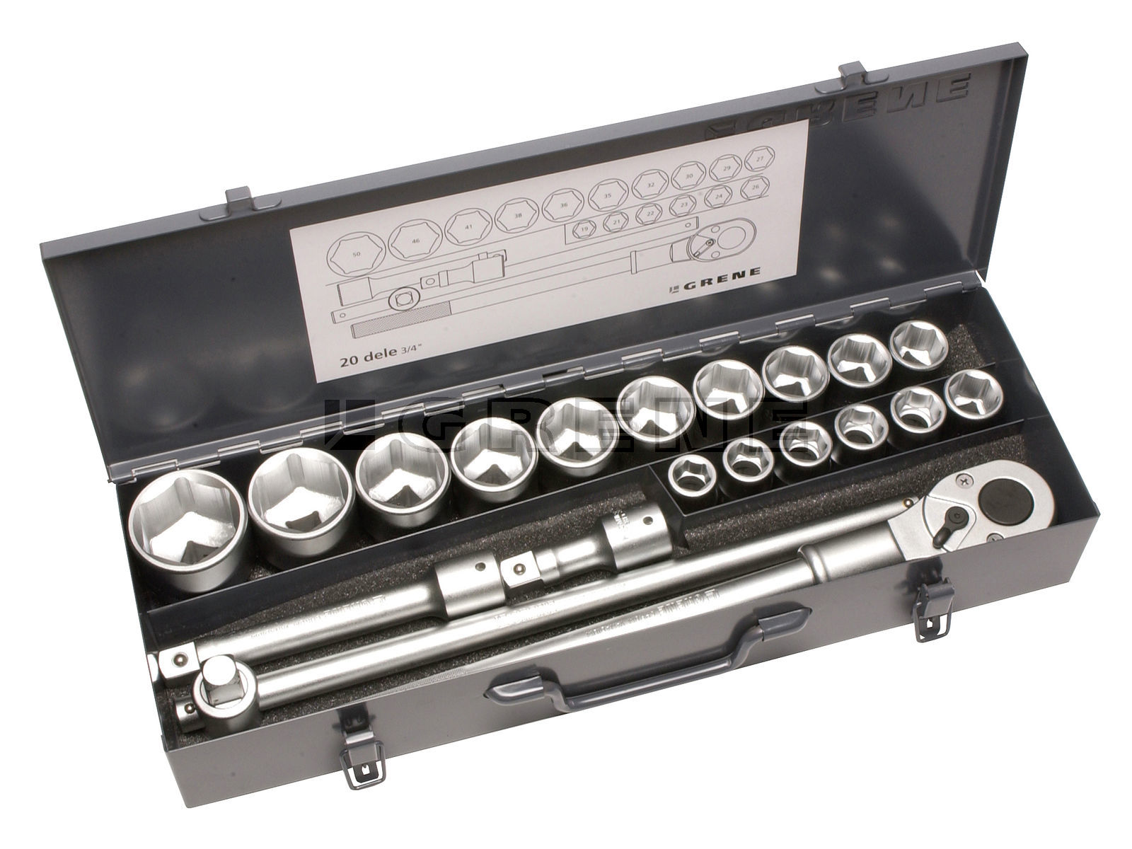 Grene 3/4' topnøglesæt med 20 dele. Fremstillet i high grade chrome vanadium steel. Indhold: Toppe: 19 - 21 - 22 - 23 - 24 - 26 - 27 - 30 - 32 - 35 - 36 - 38 - 41 - 46 & 50 mm. Skraldenøgle. Forlænger, 100 og 200 mm. T-stykke.