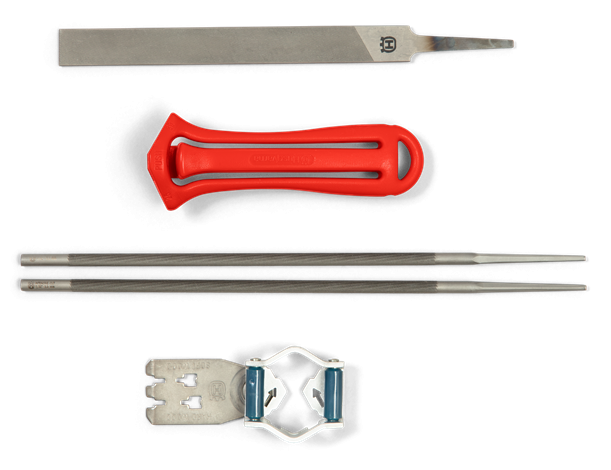 Komplet med filskaft, kombimål, 2 stk. rundfile og 1 stk. fladfil.