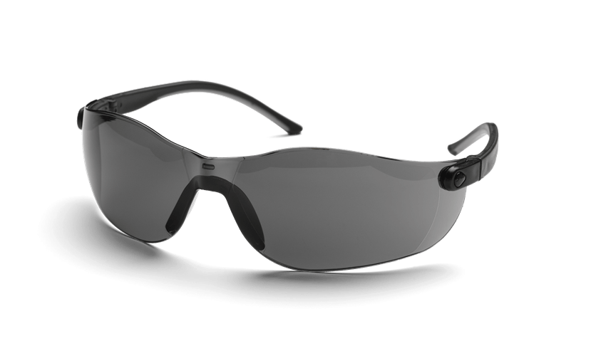 Sikkerhedsbriller med glas tonet i en grå farve med beskyttelse mod UV-stråling, der gør det lettere at se i sollys.