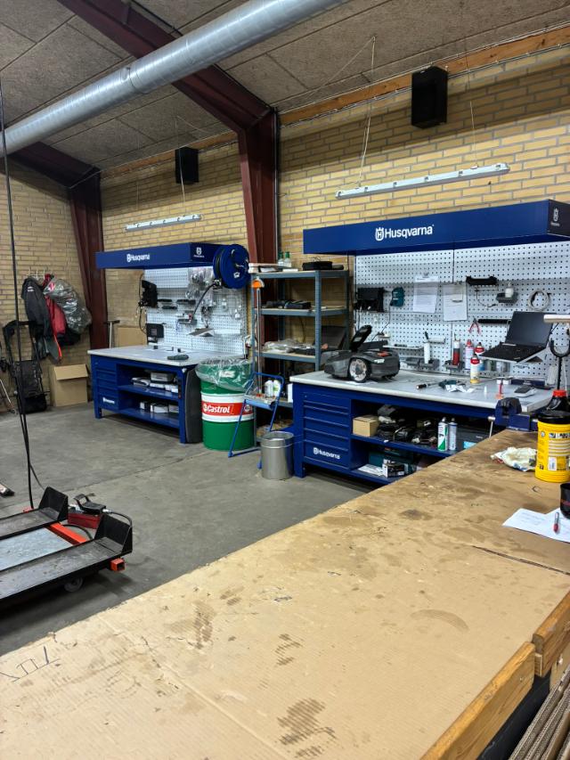 Vi tilbyder vinteropbevaring og servicering af Automower, hvilket indebærer eftersyn, montering af nye knive, opdatering og rengøring.
