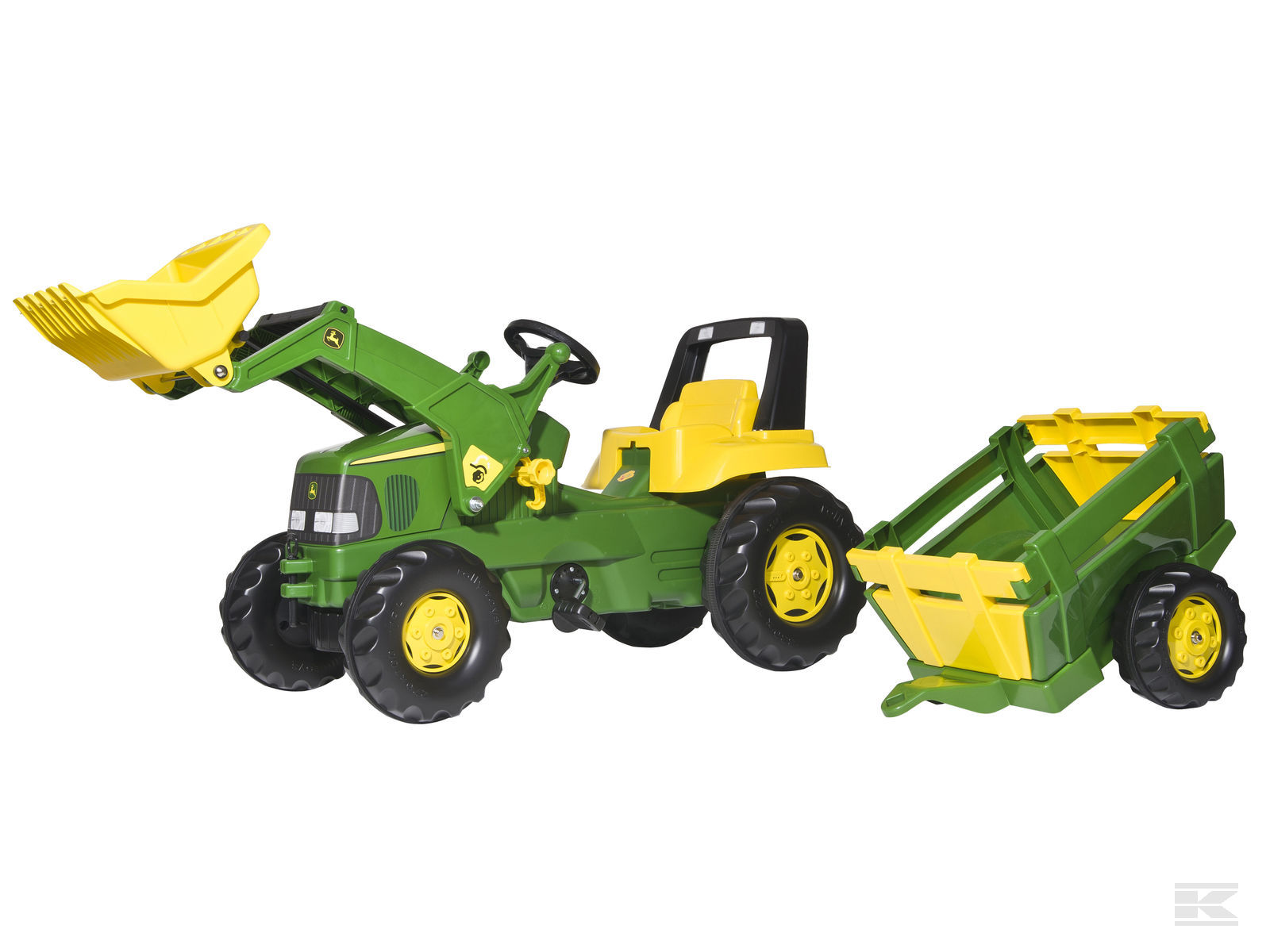 Pedaltraktor med frontlæsser og vogn John Deere.