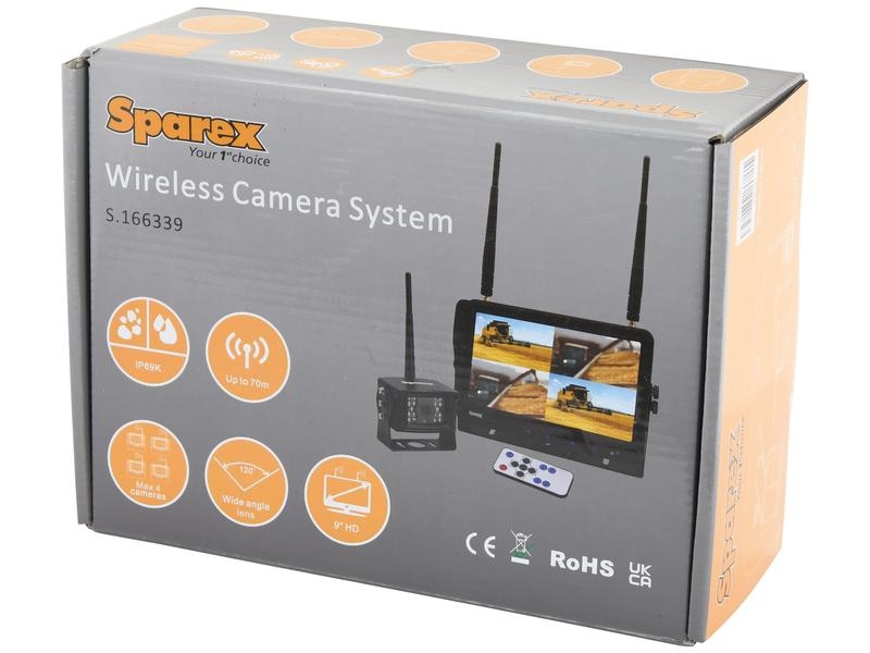 Indeholder: 1 x 9'' digital trådløs 4QUAD HD splitmonitor med lyd- og DVR-funktion, 1 x digitalt trådløst CMOS kamera med mikrofon, 1 x aftagelig solskærm, 1 x justerbar støtte, 1 x Manual