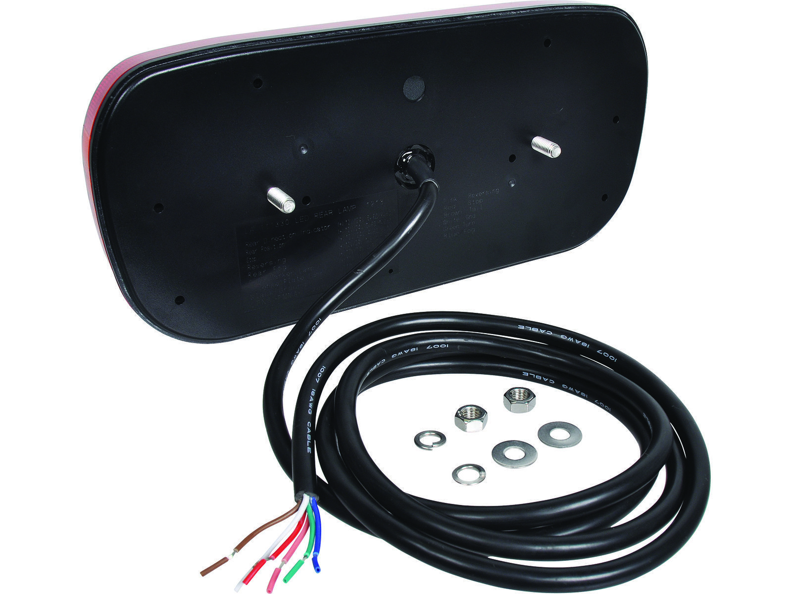 LED Baglygte Højre 12/24V Bag, blink, stop, tåge og baklygte med trekantrefleks. Mål: 315x145x32mm. Med 2m ledning. Tilslutning: Pink= bak. Rød= stop. Brun bag. Hvid= stel. Grøn= blink. Blå= tåge