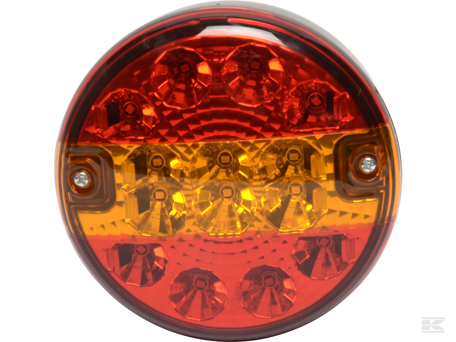 Led baglygte med bag/stop og blink. E - Godkendt. LED baglygte 12/24V Ø140 mm. monteringsbolte 6 mm Ledningsmontering: Hvid - stel. Sort - lys. Gul - blink. Rød - stop.