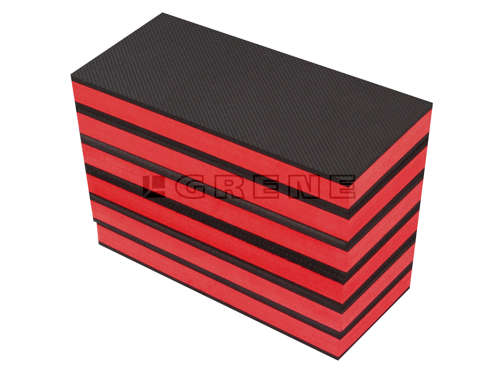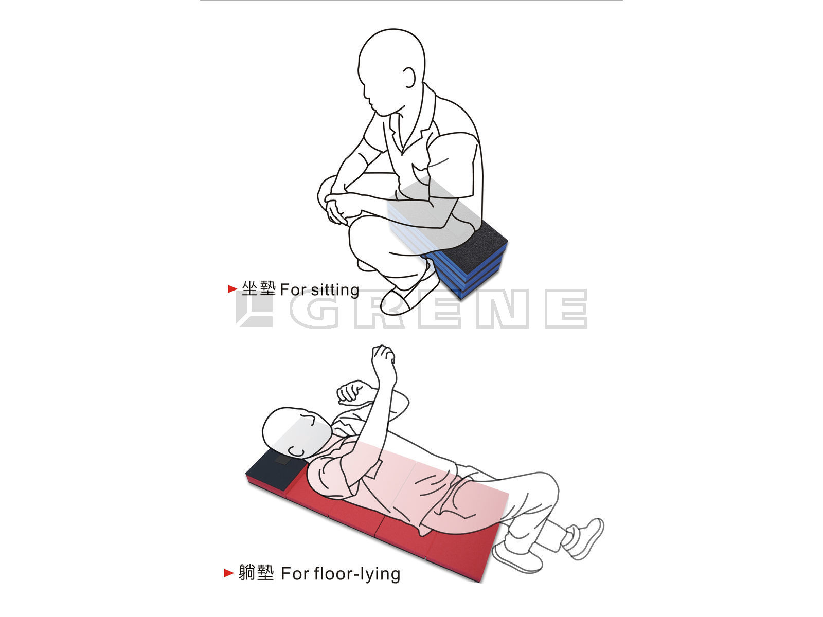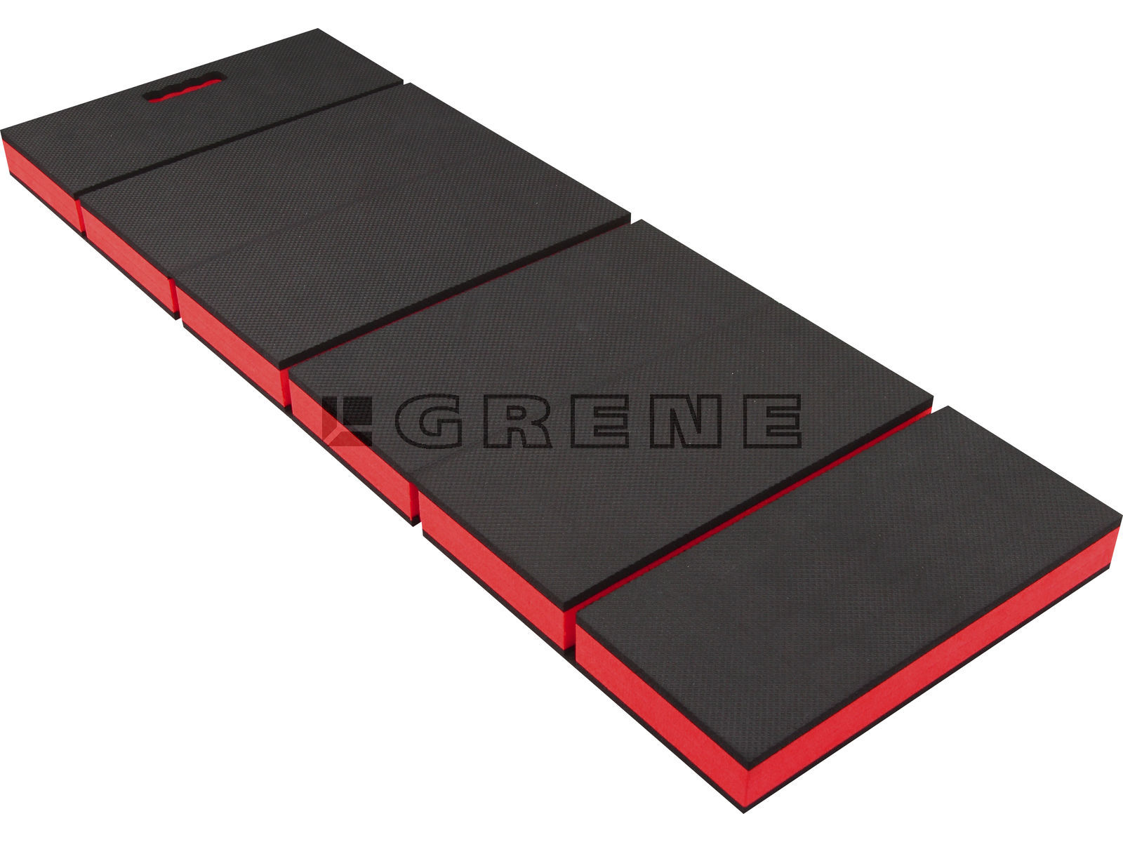 Foldemåtte med flere funktioner. Mål: L: 1210 mm x B: 420 mm T: 30 mm. 6 delt og kan anvendes som liggeunderlag, knæpude og til at sidde på. Foldemåtten er oliebestandig og kan rengøres med højtryksrenser.