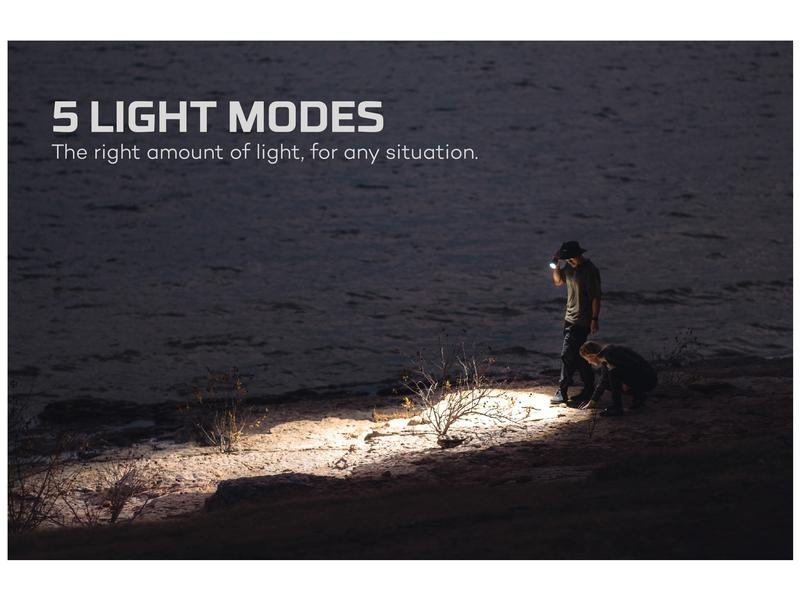 Nyd 5 lysindstillinger med glidende overgang via Smart Power-kontrol, herunder Turbo, Høj, Medium, Lav og Blitz.