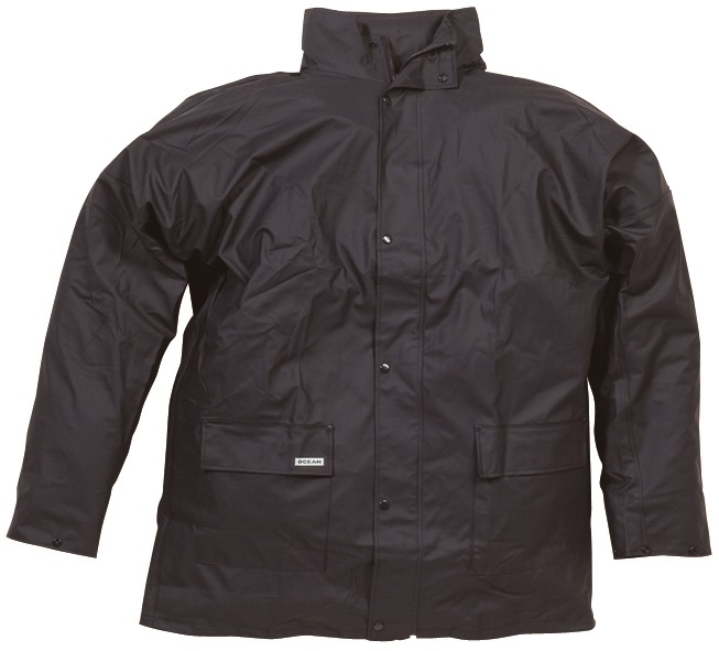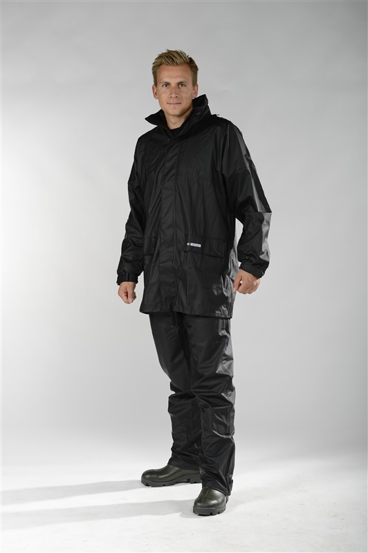 Ocean regntøj sæt - jakke og bukser i sort. Sættet består af jakke og buks i blødt og smidigt materiale, der er rivefast og kuldebestandigt. Jakk med YKK lynlås og overfald. Rygventilation, skjult hætte i kraven, to lommer med klap, justerbar snor i linning, ærmer med elastik og velcrolukning. Buks med justerbar snortræk i liv, lynlås og velcro i ben.