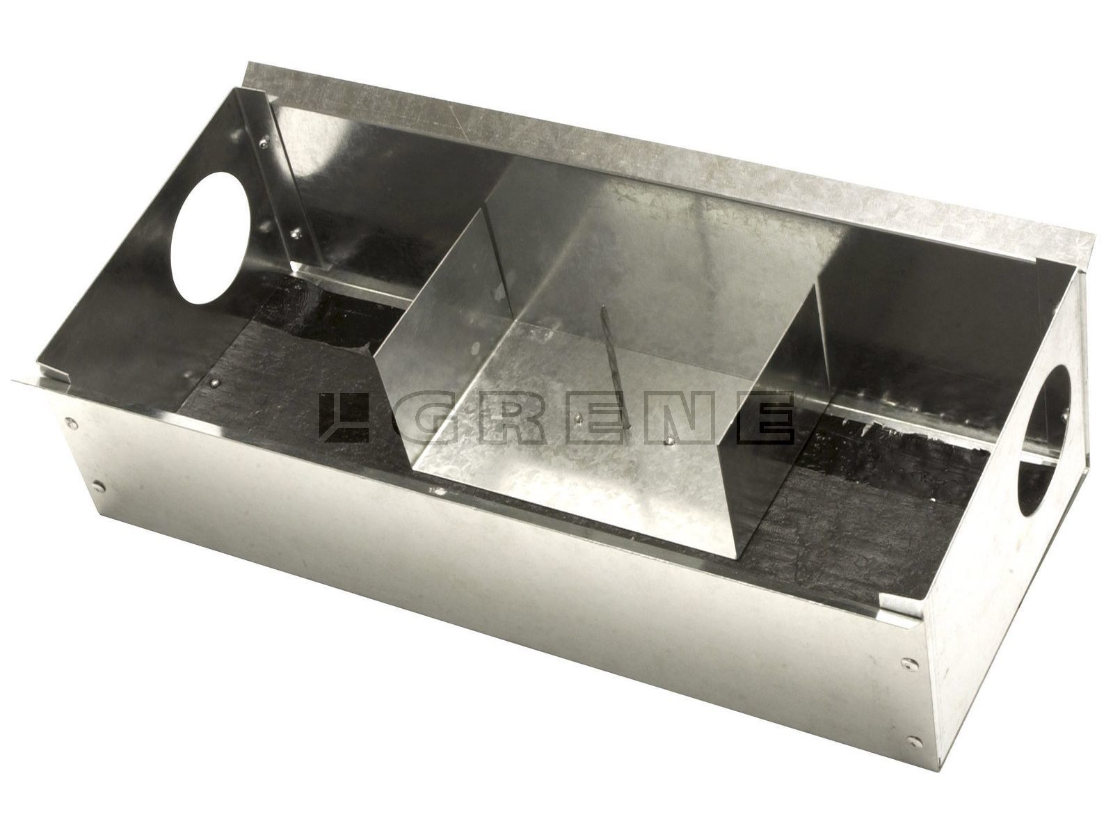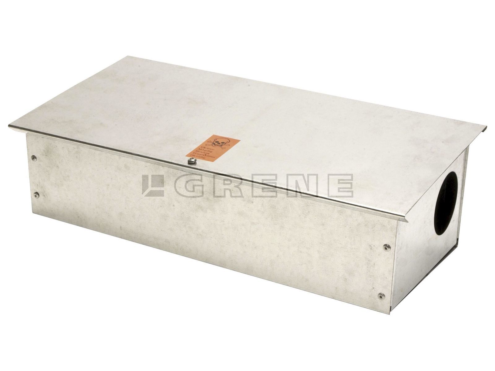 Giftstation/rottekasse. El-galvaniseret stålplade med 2 indgange, skydelåg og med skrue som lås. Incl. sort indlæg i bund. Boks med spyd.· Indgang: Ø60 mm.