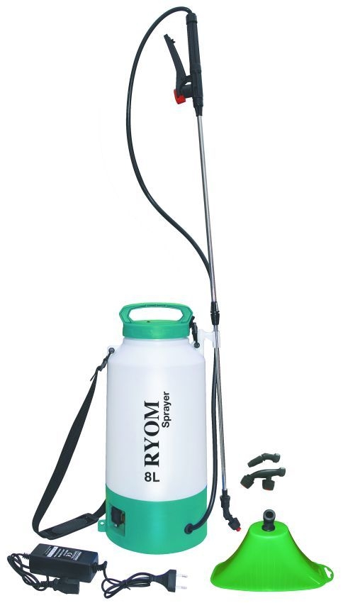 Leveres inklusiv: 75 cm teleskop sprøjterør, sprøjteskærm, 12 V oplader, batteri , 2 ekstra dyser og Bærestrop til skulder.