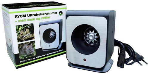 Ultralydsskræmmer Ryom. Rækkevidde 50 m2. Bruger 230V. Udsender lyd på 20-65 KHz. Virker primært mod mus og rotter, men kan også skræmme mår. Strømforburg ca. 3W. Testknap for trinløs justering af frekvens. Frekvensen skiftes manuelt, så gnaverne ikke vænner sig til lyden. Placeres op af væg eller i et hjørne, for at opnå maximal effekt. Der kan gå op til 4-6 uger, før man oplever virkning af skræmmeren.