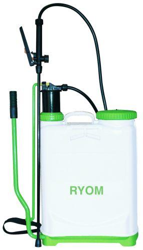 Rygsprøjte model RYOM. Pumpehåndtag i siden. Nylon bæreremme. Indhold 16 liter.X