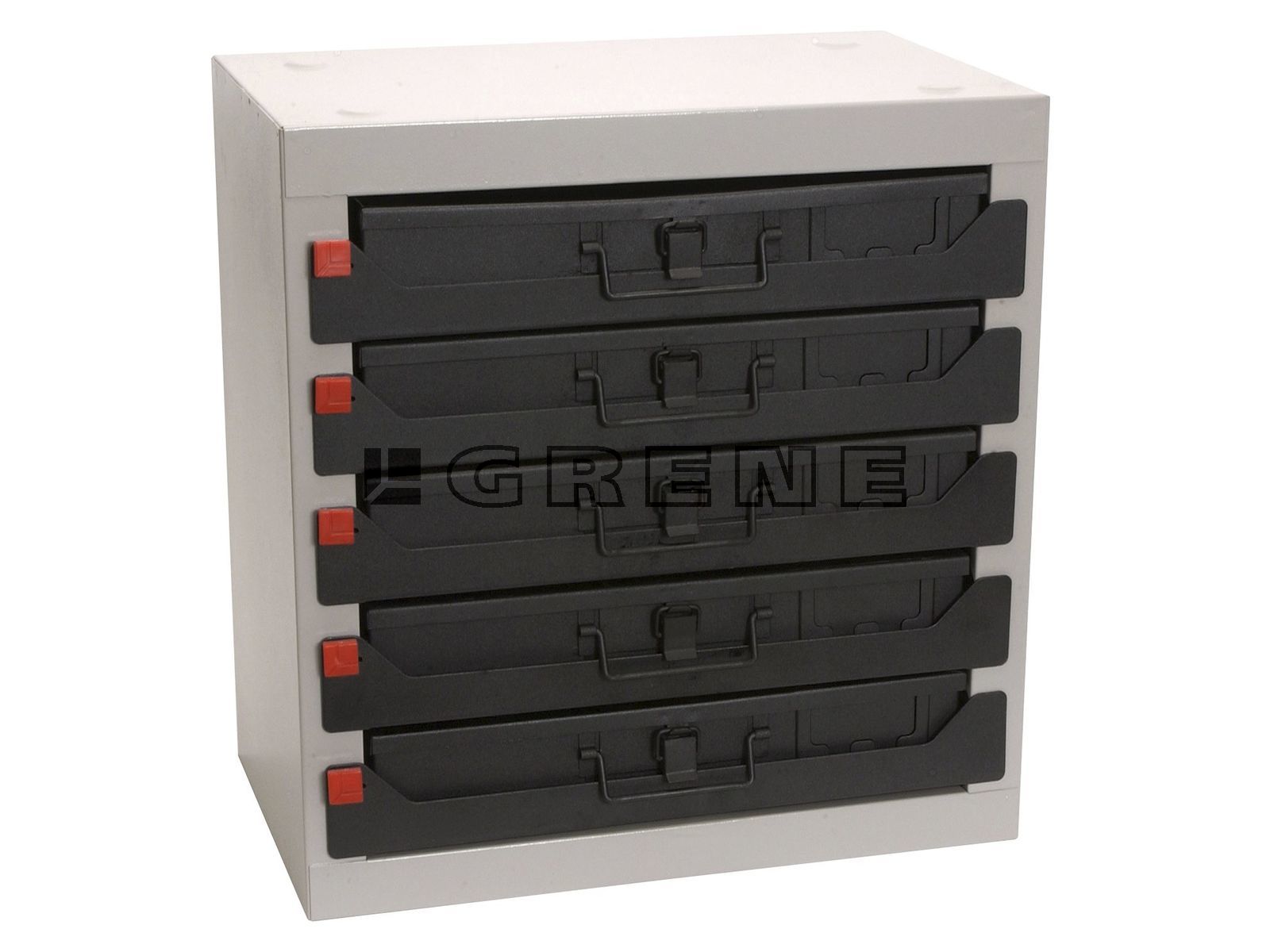Skuffereol med 5 sortimentskasser Grålakeret metal. Med lås. Leveres uden indsatser og indhold.