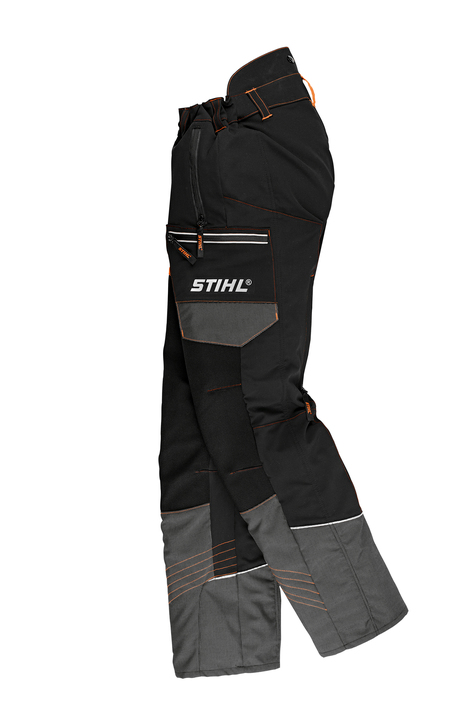 Disse sikkerhedsbukser er udviklet eksklusivt til STIHL i det ultra lette sikkerhedsmateriale AVERTIC™ pro lite (Design A, sikkerhedsklasse 1 =ˆ 20 m/s). Farven er sort og signalorange. Bukserne er speciel konstrukteret i skridtet for øget bevægeligheden. Yderstoffet er ekstremt robust, elastisk og åndbart. Elastisk og vandtæt knæbeskyttelse. Endvidere udstyret med torne- og fugtbeskyttelse nederst på buksebenene samt smudsafvisende, lange ventilationslynlåse bagtil.