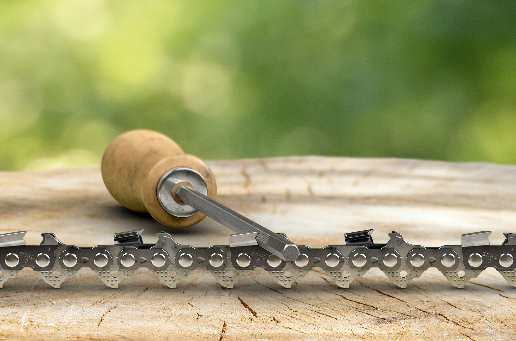 Sæt indeholdende 2 kæder, 1 Hexa fil og 1 træhåndtag.