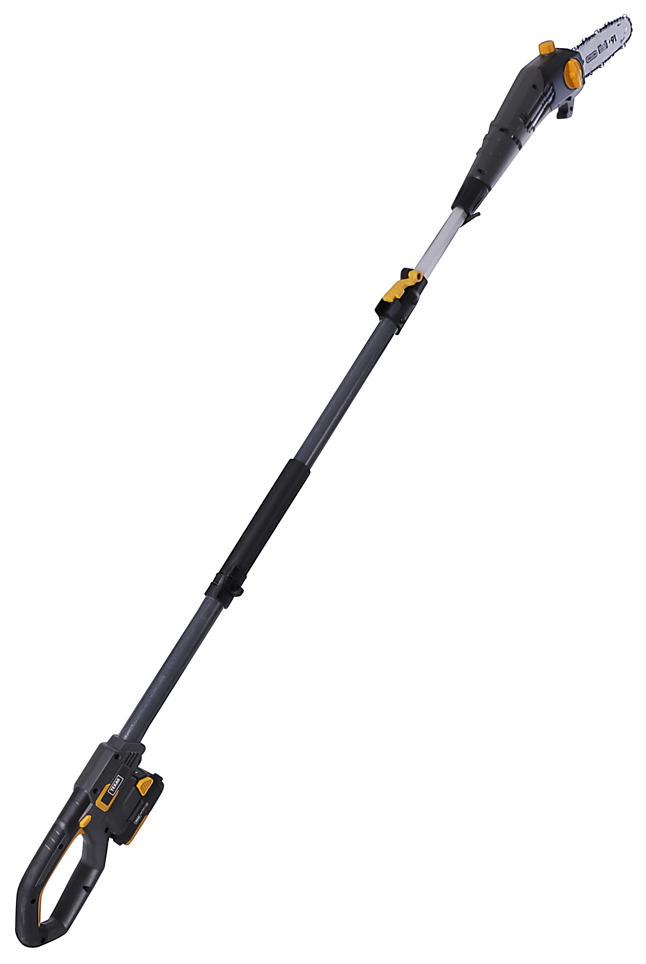 Stangkædesaven er udstyret med teleskopskaft, så totallængden kan ændres fra 192 cm til 259 cm - uden brug af værktøj. En stangsav er mere sikker at bruge end en almindelig kædesav, da det lange skaft giver en tryg afstand til området, hvor der skæres. Længden på beskæringssaven gør, at man med fødderne solidt plantet i jorden kan komme højt op og beskære grene - uden at skulle balancer på en stige eller lignende, og med en maskine på batteri får du bevægelsesfrihed, da du slipper for at bøvle med ledning - lige som du undgår larm fra en benzin motor. Sværdet er 8' (20 cm) og klarer grene op til tilsvarende diameter. Kædeolie påfyldes i tanken på skærehovedet. Der er automatisk kædesmøring, og en tilpas stor støtte (barksted) på undersiden af savhovedet sørger for, at man let kan holde saven fast mod den gren man skal save over. Stangsaven leveres med et 20V / 2.0 Ah batteri og en hurtig lader (60 min.) Vægten er kun 3,0 kg. (3,4 kg. inkl. batteri).Levering