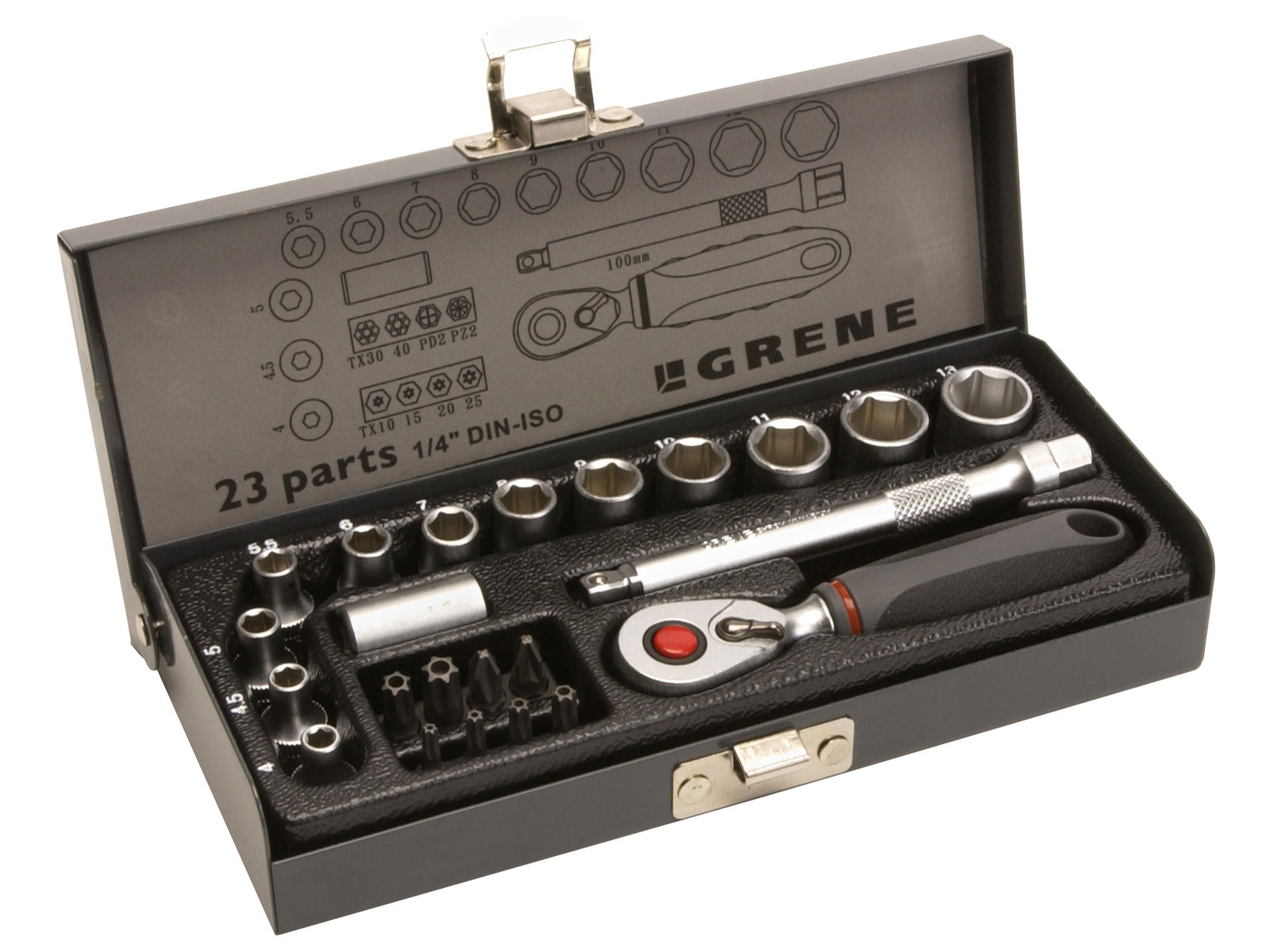 Grene 1/4' topnøglesæt med 23 dele, 4-13 mm. 72-tands skraldenøgle. Fremstillet i highgrade chrome vanadium·