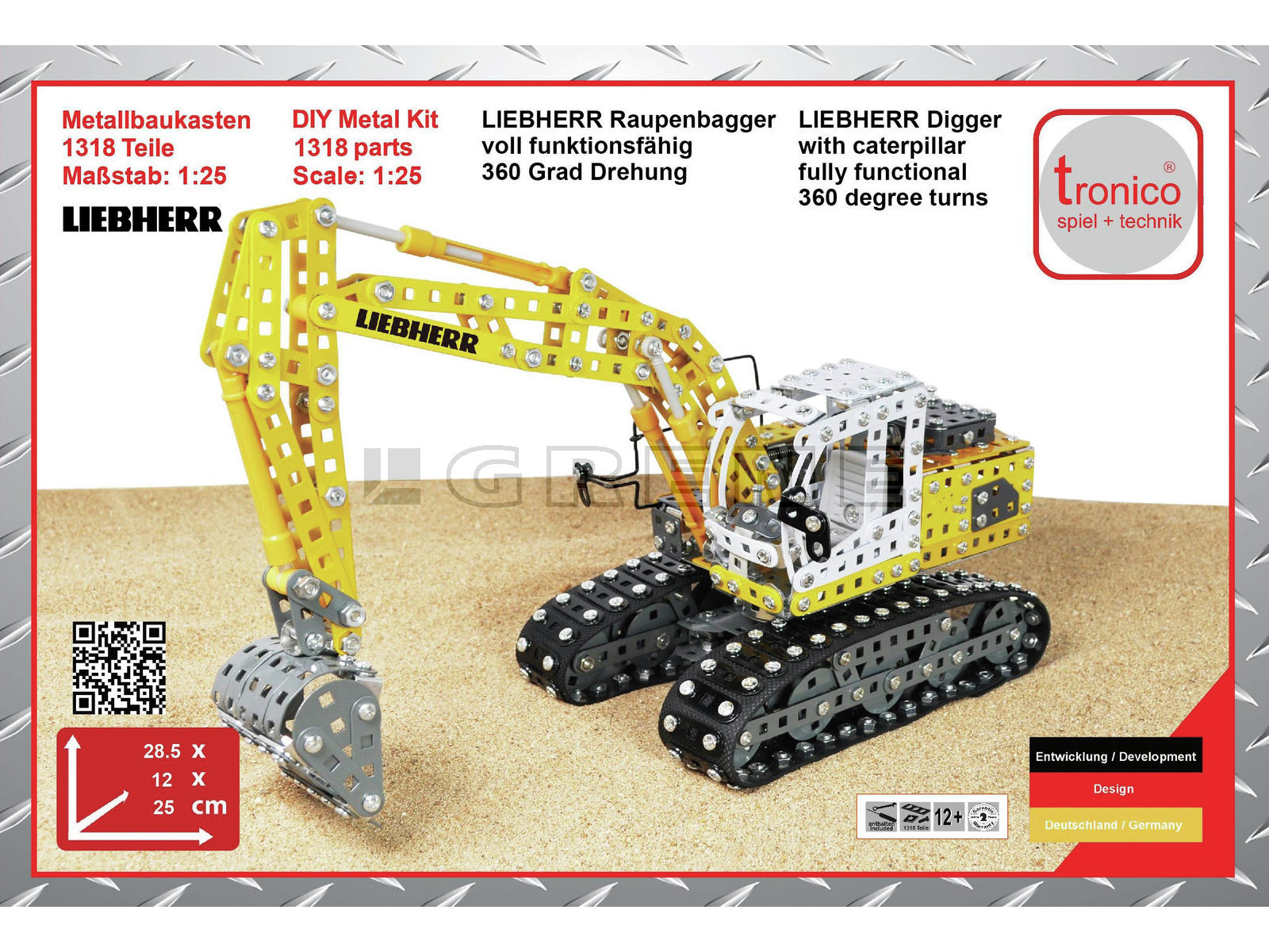 Tronico T10100 Legetøjs Liebherr gravemaskine på larvefødder 45 x 30,5 x 7 cm Byg selv maskine i metal som er fuld funktionsdygtig, drejer 360 grader. Indeholder 1.318 dele Størrelsesforhold 1:25