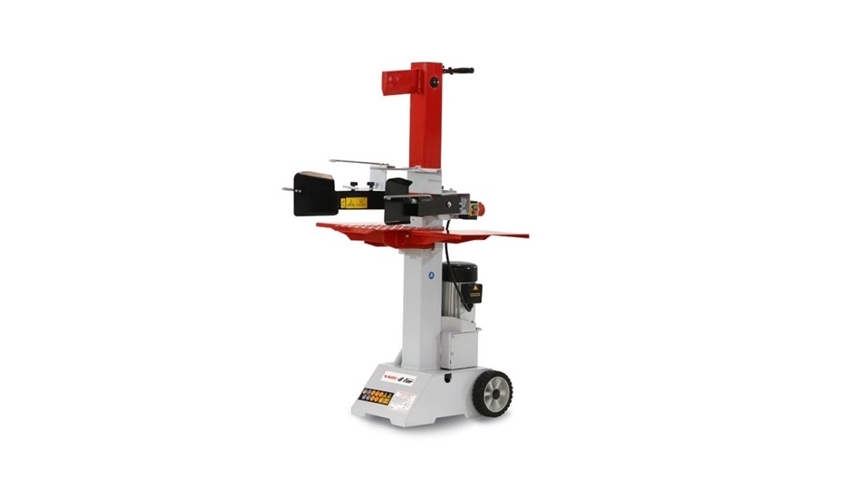 Elektrohydraulisk vertikal brændekløver som yder et maks. tryk på 8 ton.